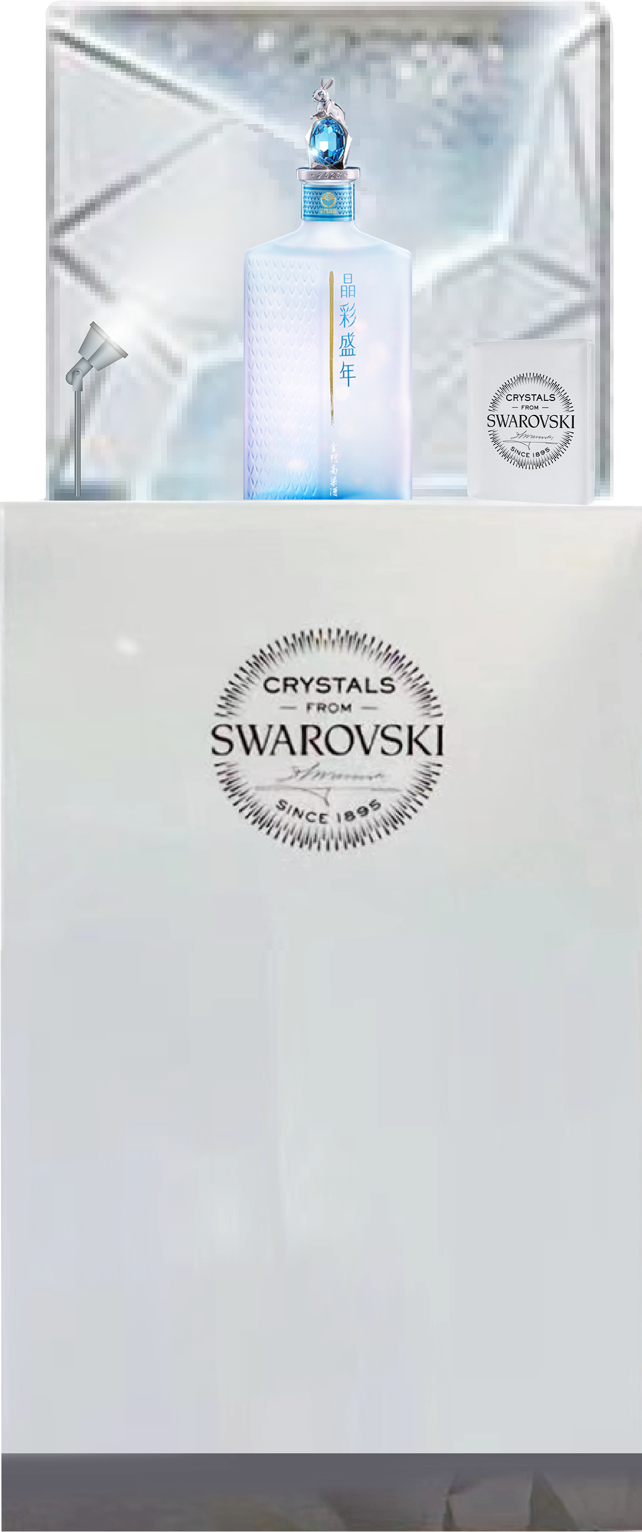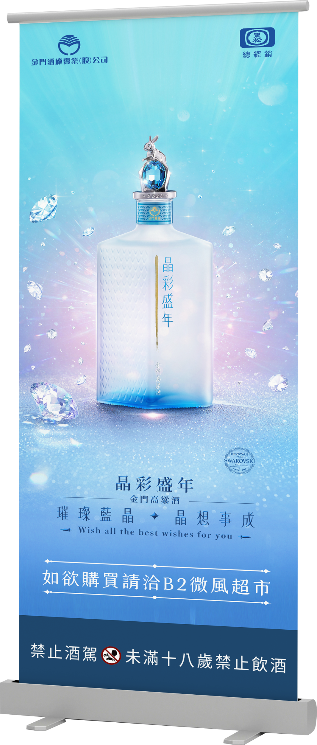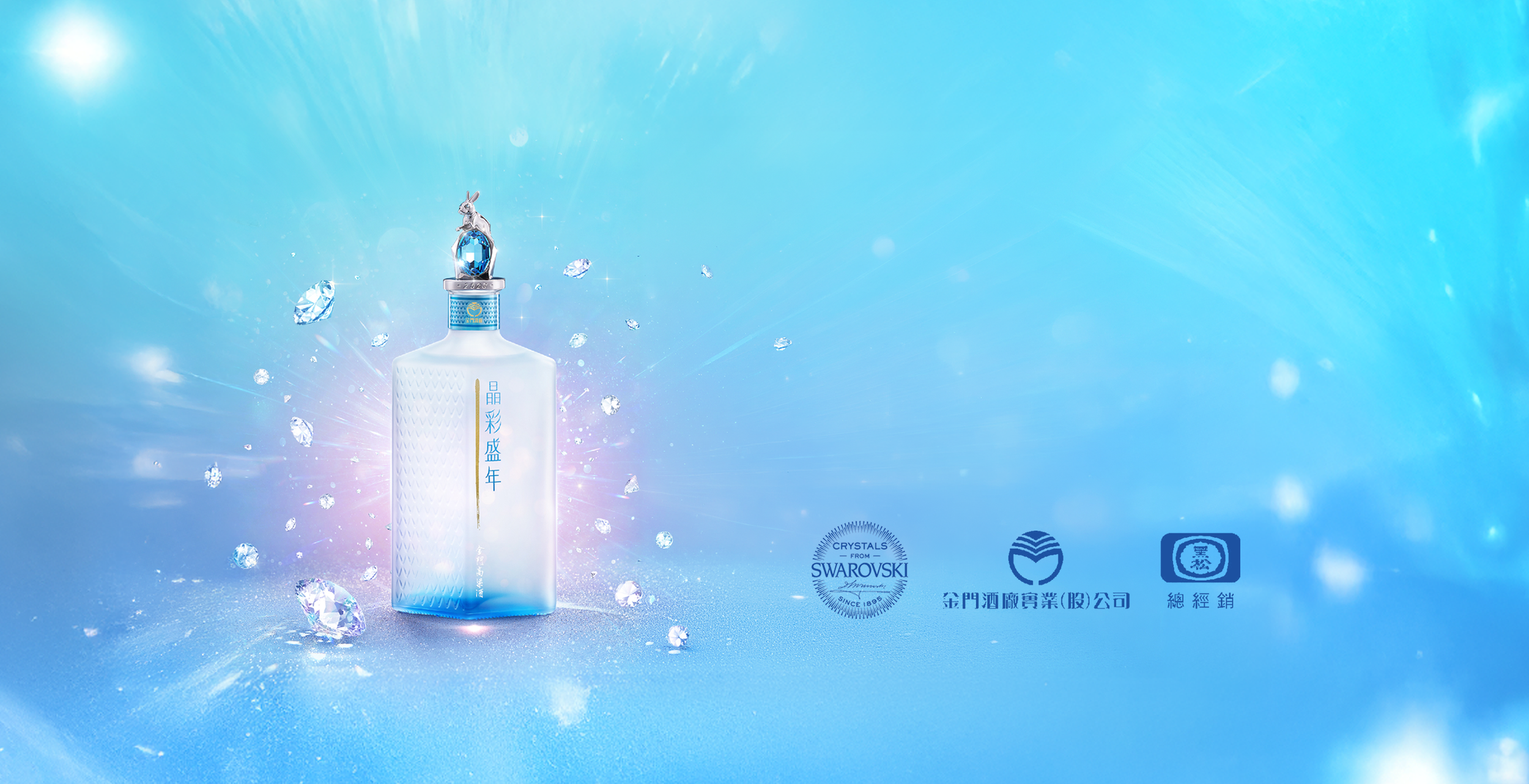 The "Crystal Elegance Kinmen Kaoliang Liquor" project integrates the brilliant qualities of Swarovski crystals. This initiative focused on precisely translating the "Crystal Blue" and "Light-Refracting Facets" of the product packaging into a physical exhibition language. Through seamless visual extension, the brand identity achieves high consistency from 2D graphics to 3D space, reinforcing the luxurious tone of this premium spirit.