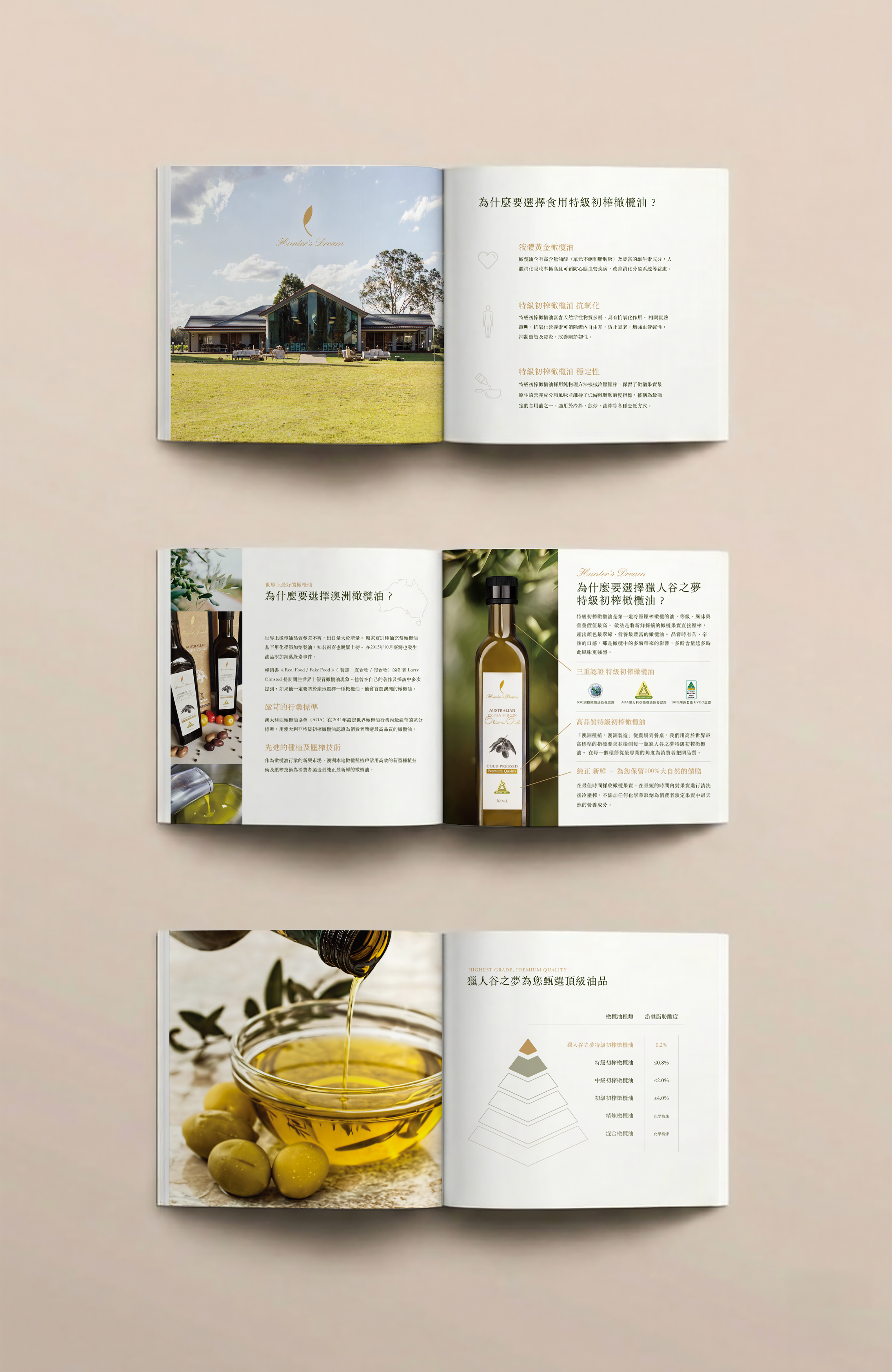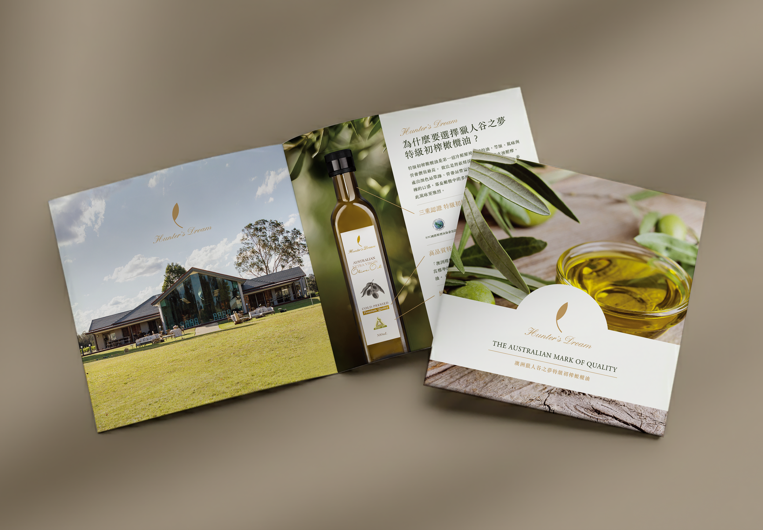 Classic serif typography was selected to create a balance between the timeless character of a traditional estate and the precision of modern craftsmanship. Through a combination of rational visual structure and emotive imagery, the brochure positions Hunter’s Dream as a benchmark for premium extra virgin olive oil, conveying the purity and integrity of its Australian origin.