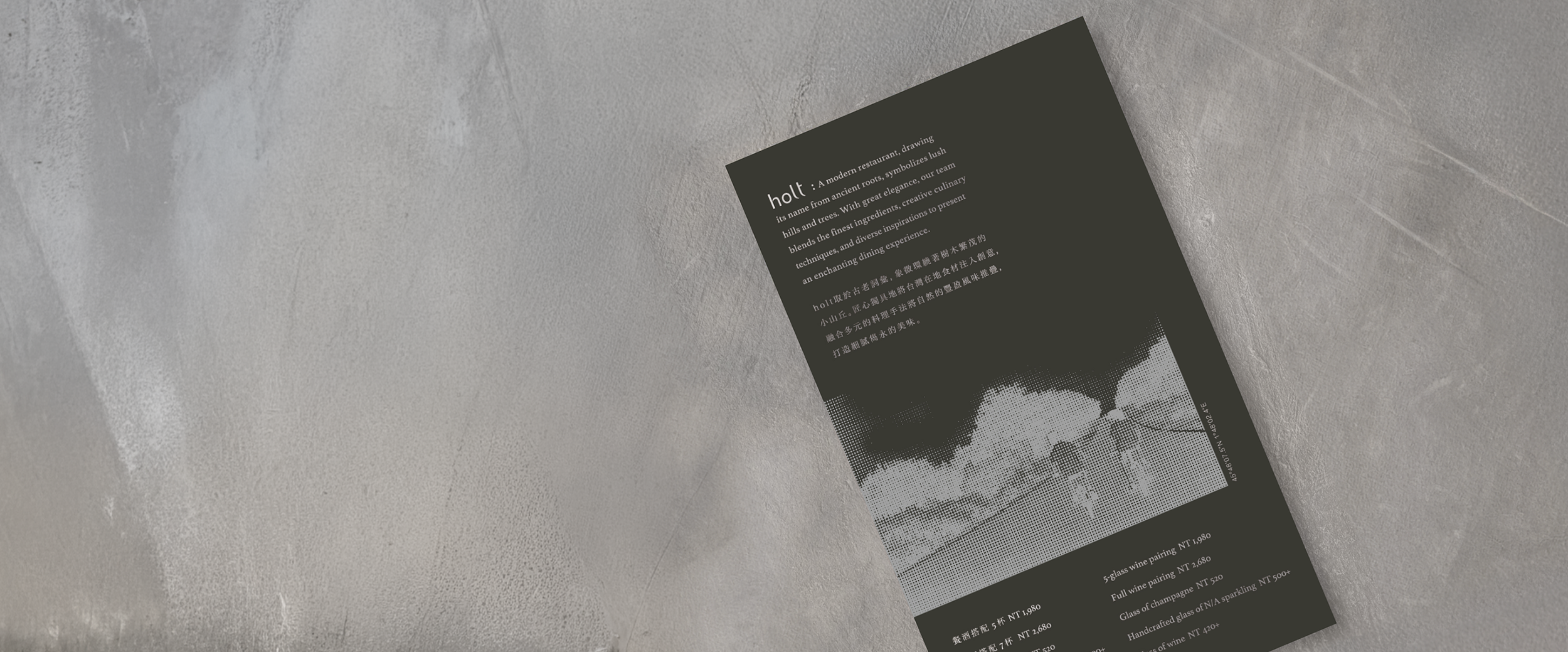 The design for the Wine Pairing Menu centers on a visual experiment with photography. Through halftone digital processing, landscape imagery is transformed into a granular artistic expression, seamlessly integrated with matte silver ink and fine paper textures. This subtle technique allows the images to reveal dynamic shifts in light and shadow from different angles, precisely echoing the chef’s meticulous layering of flavors and extending the overall dining experience into the depths of visual and tactile artistry.